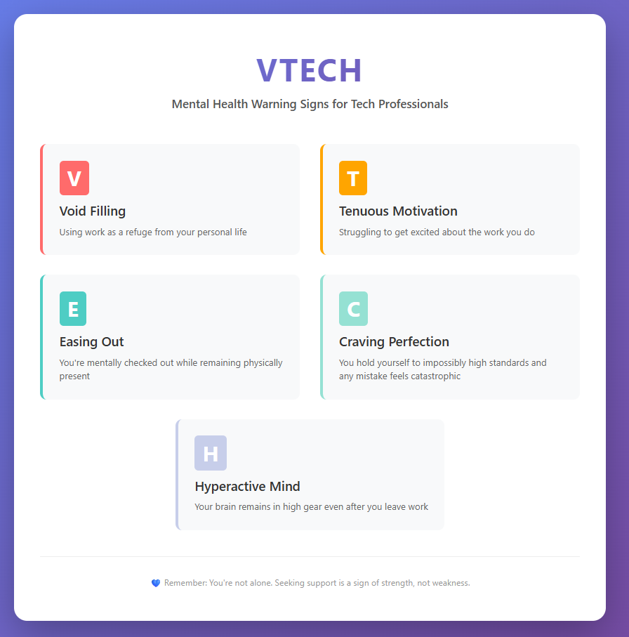 The tech industry's culture of constant innovation, relentless deadlines, and always-on availability creates a unique breeding ground for mental health challenges that affect even the most resilient professionals.